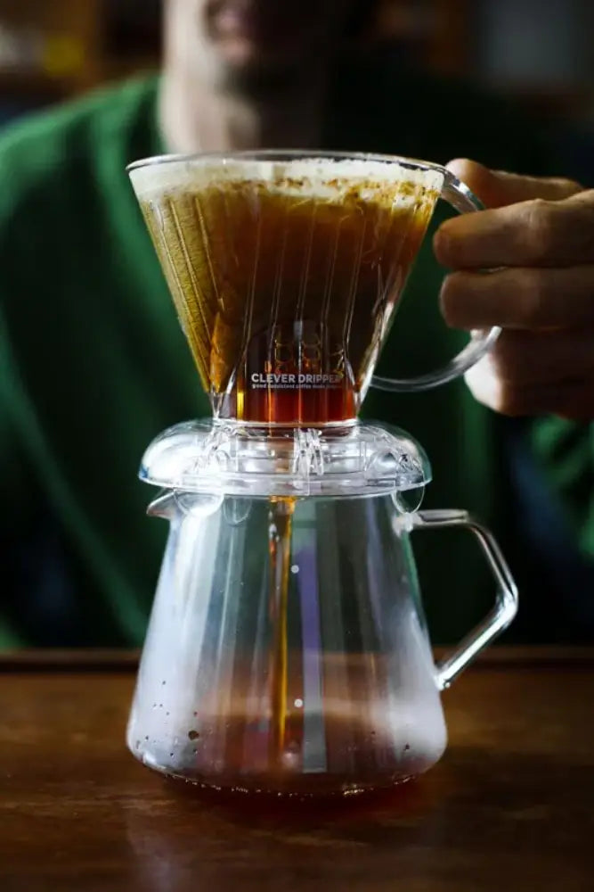 - Place the Clever over a jug/cup and the coffee will begin to filter.