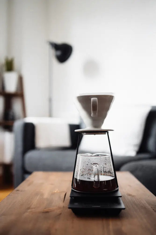 - Place the dripper on the scale, add the coffee and distribute it evenly, tare the scale and start the timer.