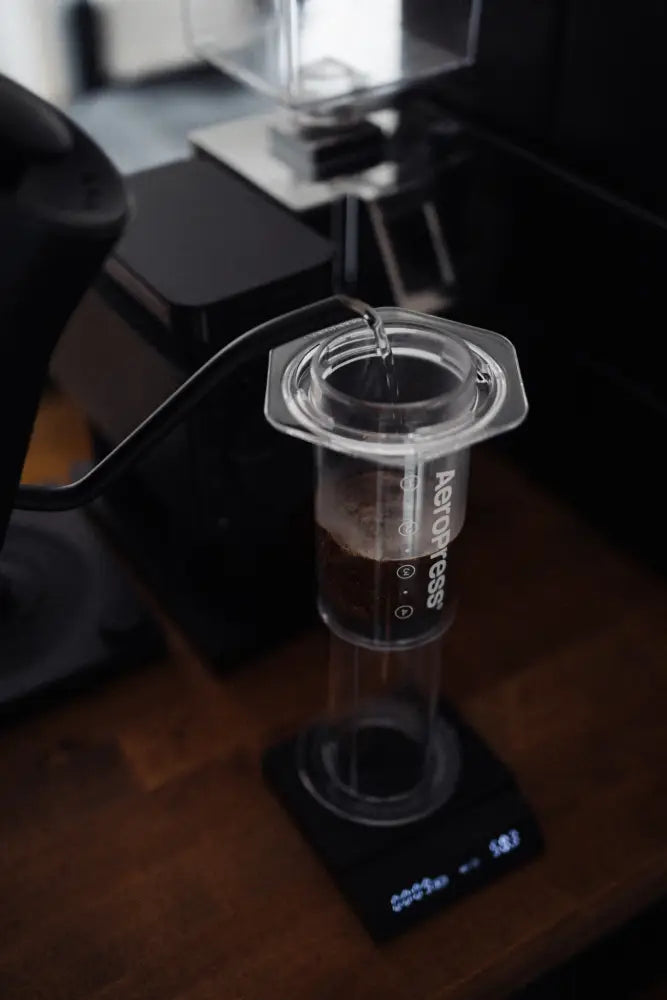 - Place the AeroPress on the scale, add the coffee, tare the scale, and start the timer.