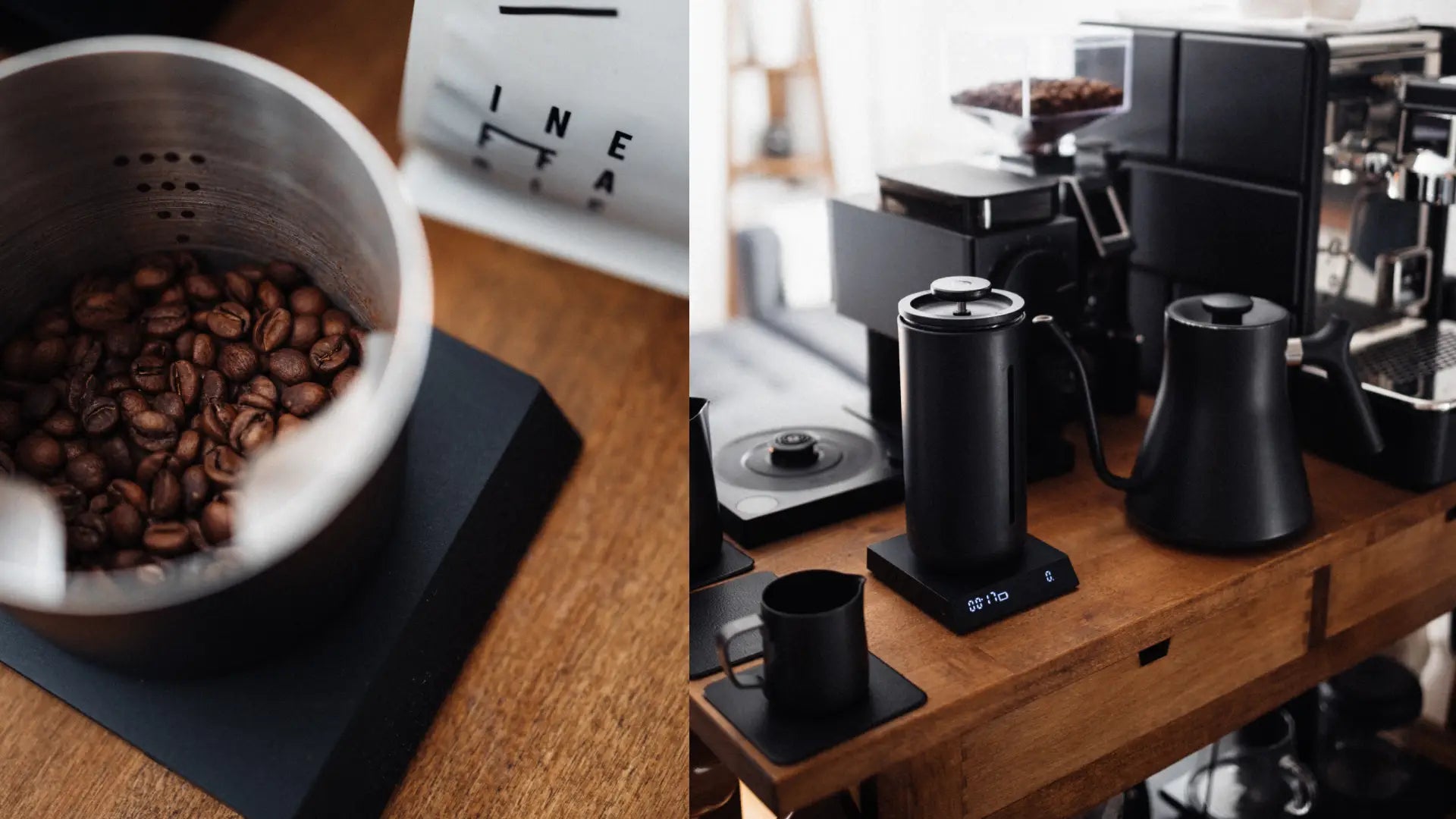 - Añade el café y distribuye uniformemente el café, tara la báscula e inicia el cronómetro.